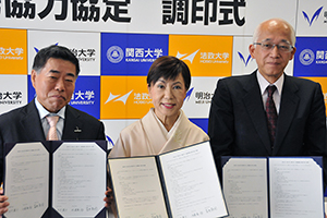 (左から)明治大学土屋学長・本学田中総長・関西大学芝井学長
