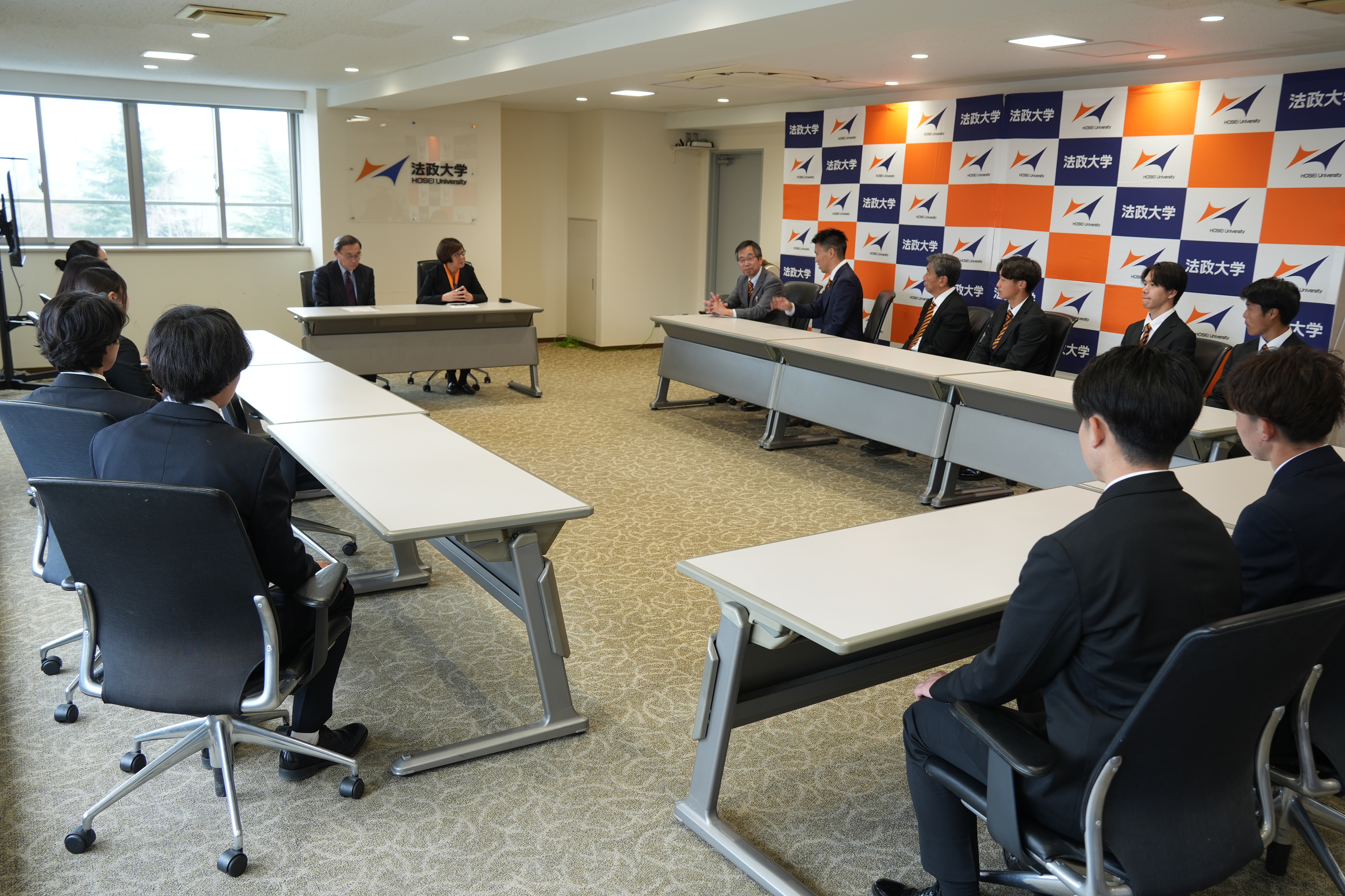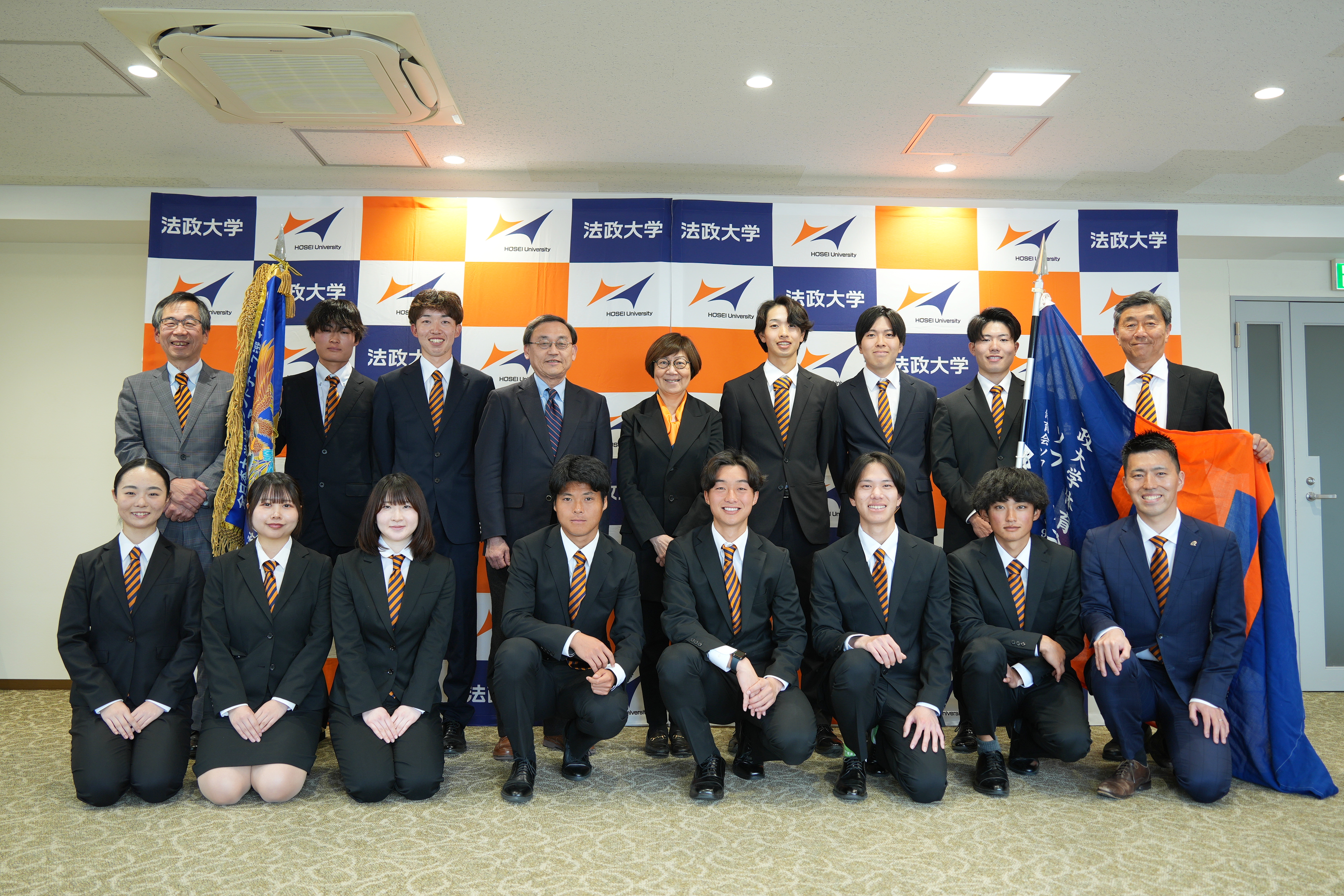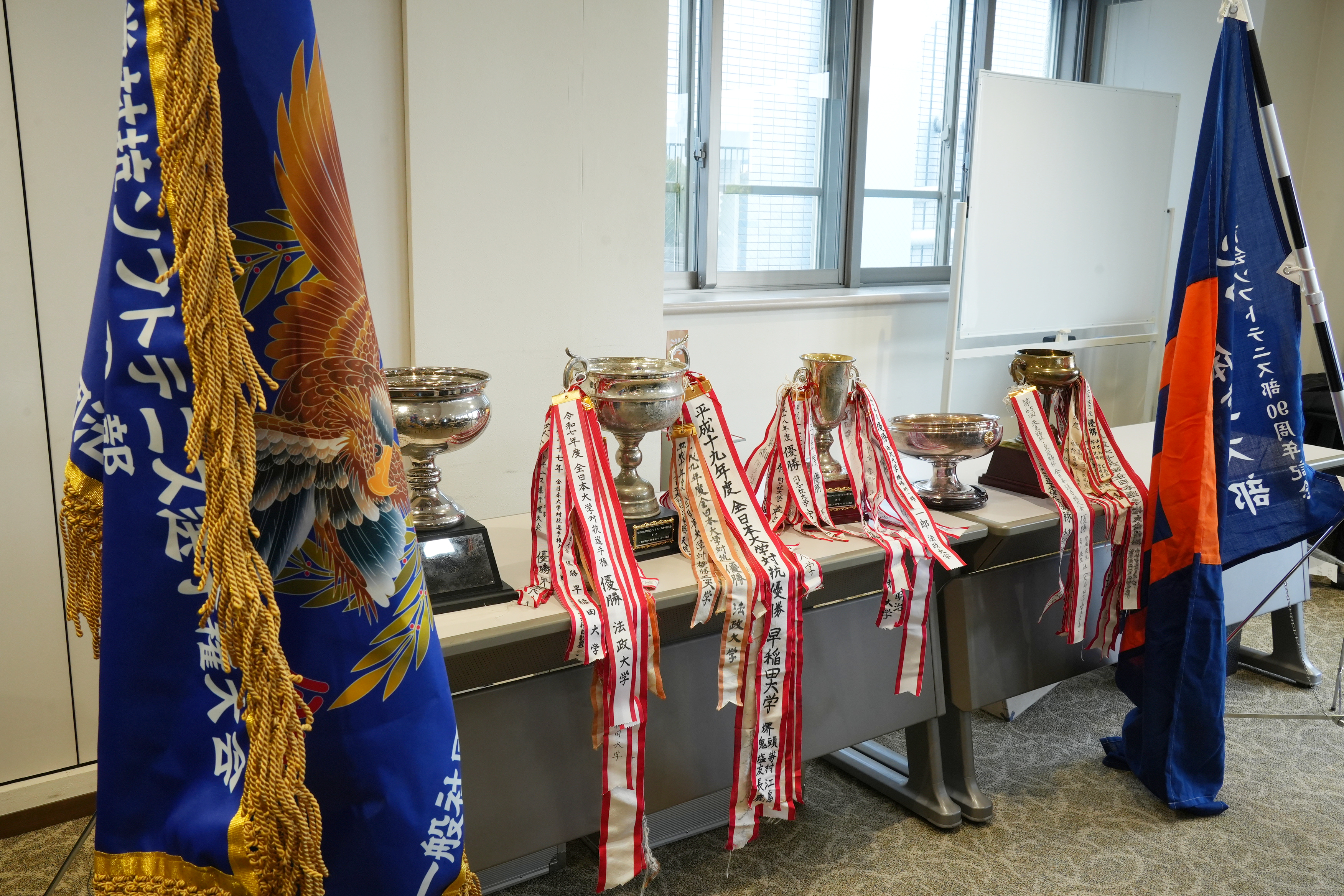 報告会には、ソフトテニス部から川上忠重部長(理工学部教授)、高橋和孝監督、大野勝敏コーチ、増田裕介選手(理工学部)、高橋拓己選手(社会学部)、橋場柊一郎選手(経済学部)、菊山太陽選手(経済学部)、桒原充樹選手(現代福祉学部)、田中蘭聖選手(経済学部)、初鹿暁哉選手(経済学部)、野本凌生選手(社会学部)、内田陽斗選手(経済学部)、中井藍子マネージャー(社会学部)、比嘉綾音マネージャー(社会学部)、西村実祈マネージャー(経済学部)の15名が出席しました。