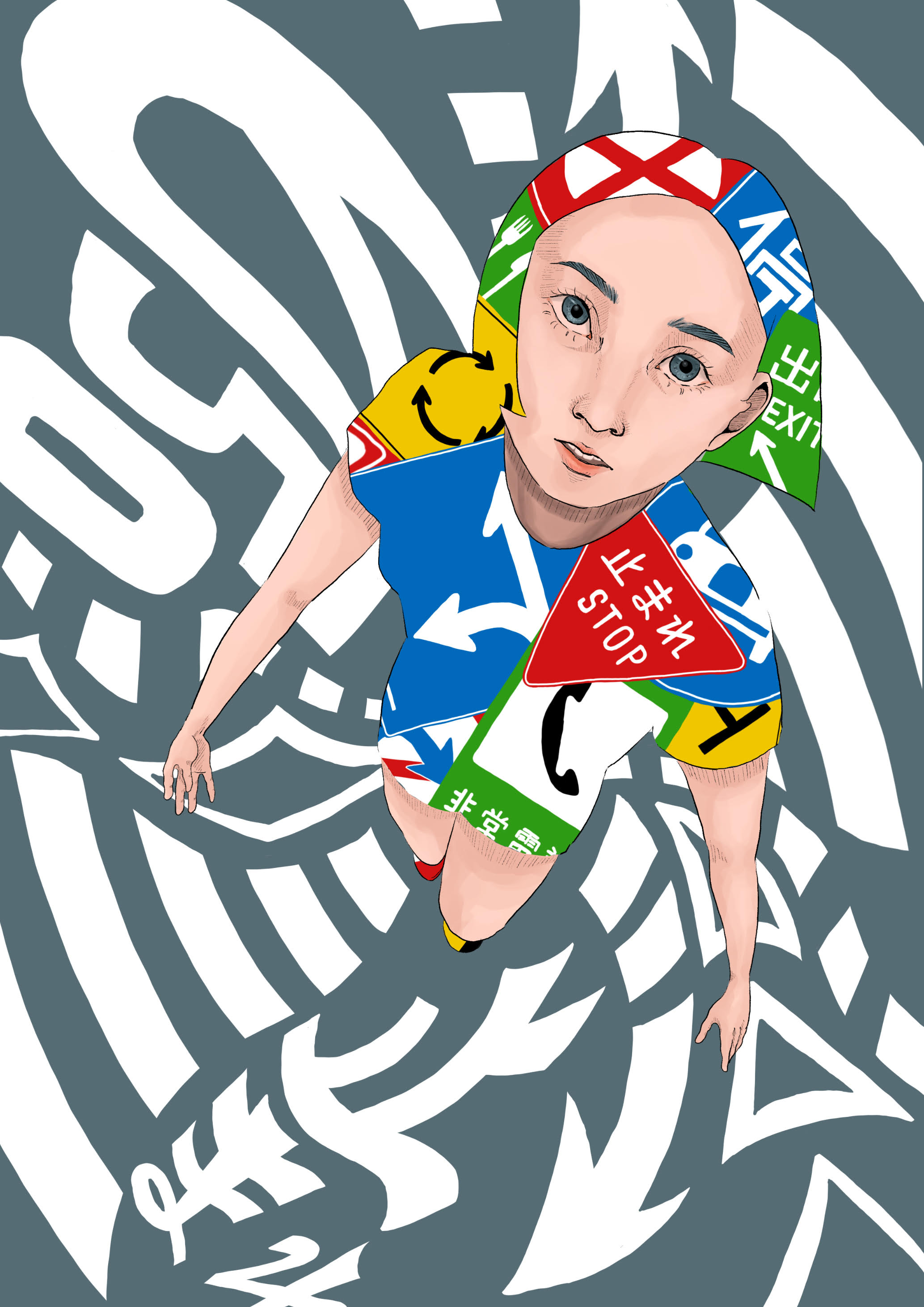 クリッピングマスクを使って、人物に色を塗りました。まず標識はそれぞれ別レイヤーに描き、人物レイヤーの上にバランスよく配置し、髪や服に沿って切り抜きしています。また肌の陰影も、最初に人物の体全体に肌色を塗り、その上から光や影を付けて、体の形に沿って切り抜きしています。