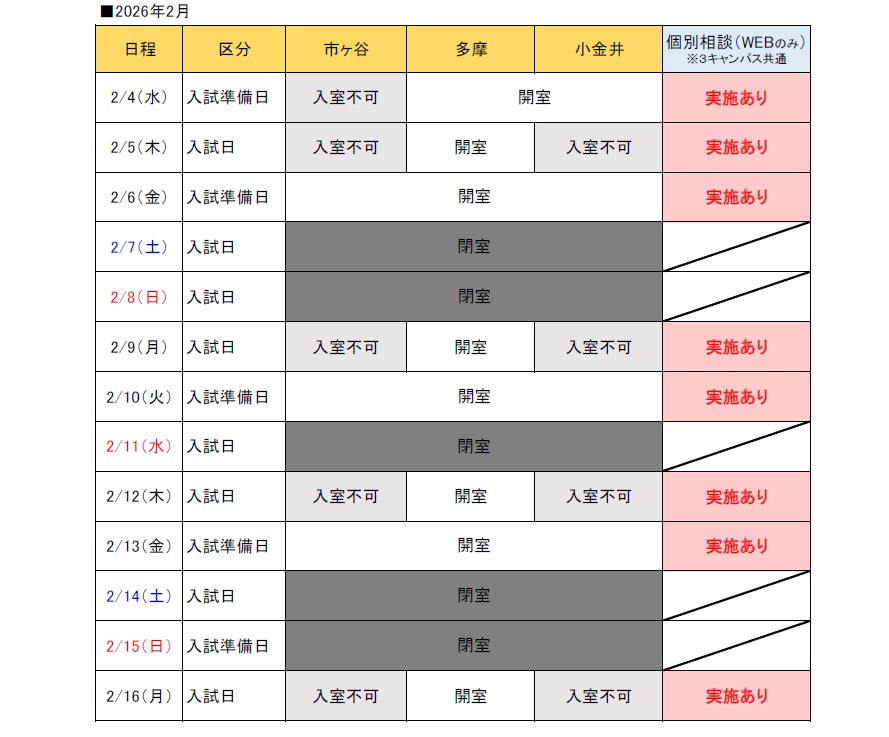 ※「開室」「入室不可」時の業務対応時間は9時~17時(多摩・小金井キャンパスは11:30~12:30は除く)です。
