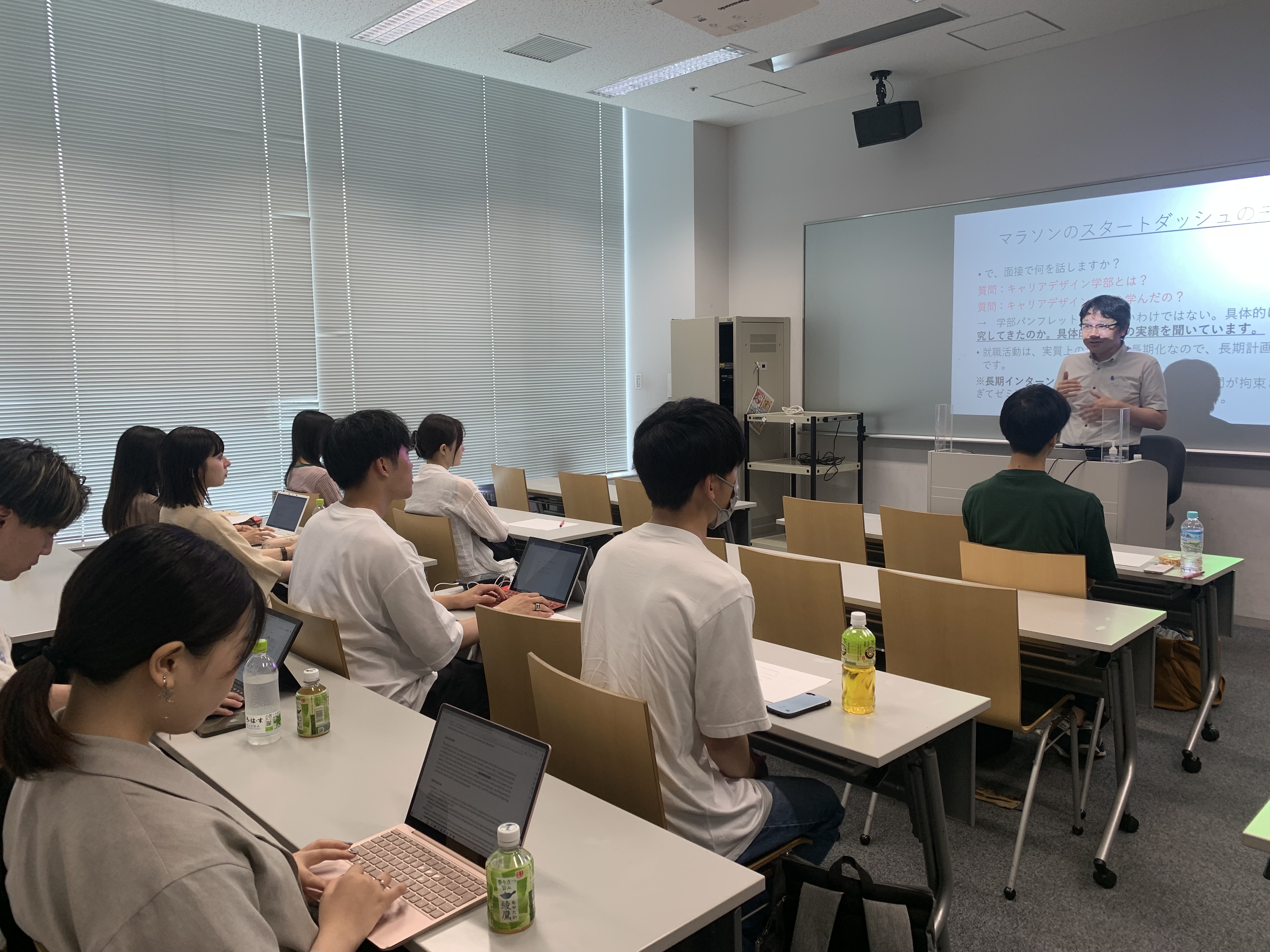 3年生の夏以降には、インターンシップから始まる就職活動が盛んになります。キャリアアドバイザーによる個別相談会、就職先を決めた4年生から後輩に向けたアドバイスが行われています。適切なタイミングで、具体的な支援を提供し、一人ひとりの学生がキャリアを展望し、選択できるように促します。その他、就職活動を始める前の心構えについて、自己分析の方法、集団・個人面接対策など、段階に応じてさまざまなセミナーを開き、学生たちの就職活動をきめ細かく支援しています。