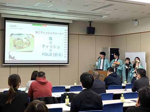 次点は、ネコ型ペーパークラフトを商品化し販売活動まで行った紙小津産業班です