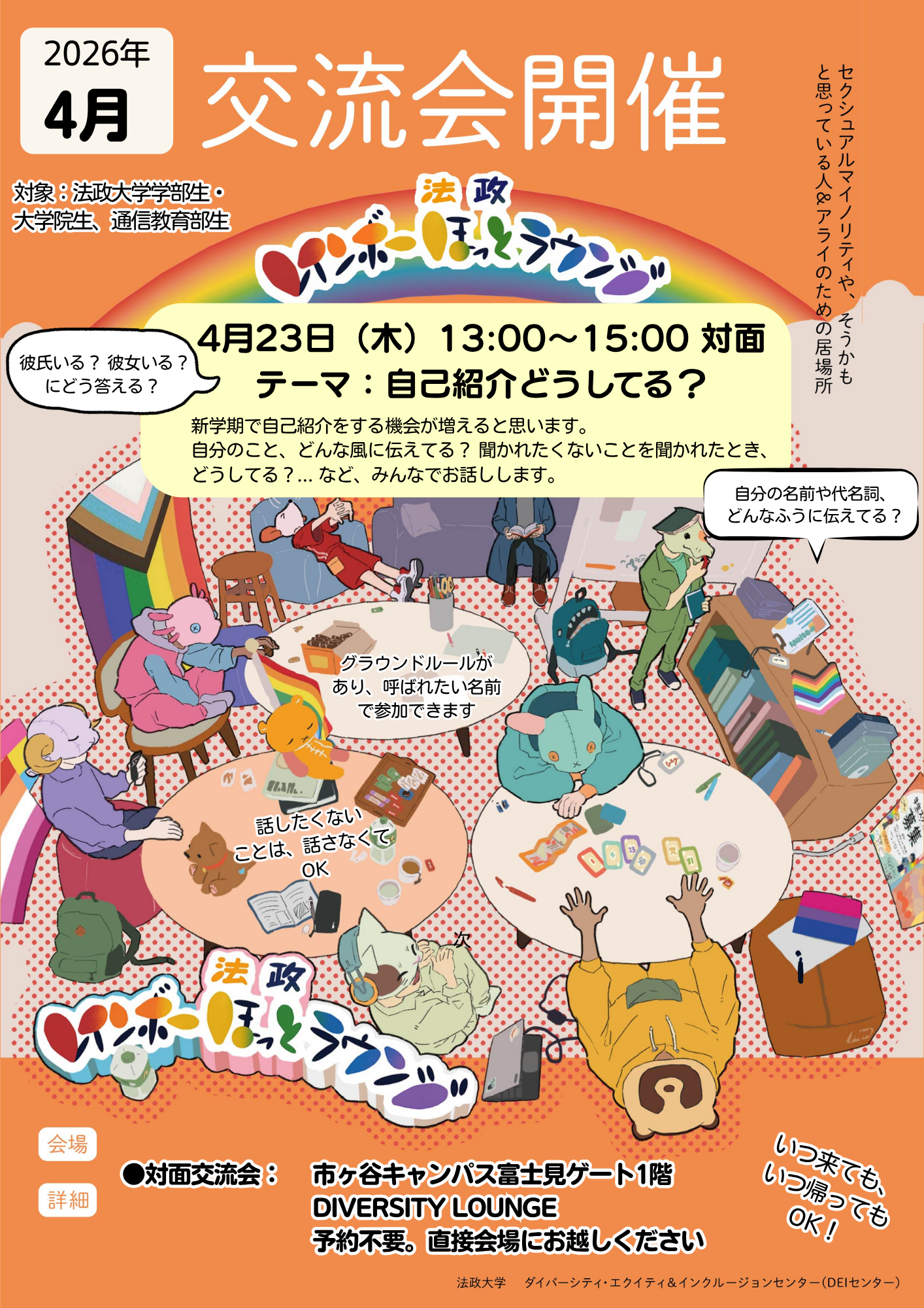 【4月市ヶ谷対面開催】学生企画「法政レインボーほっとラウンジ~ 自己紹介、どうしてる?」