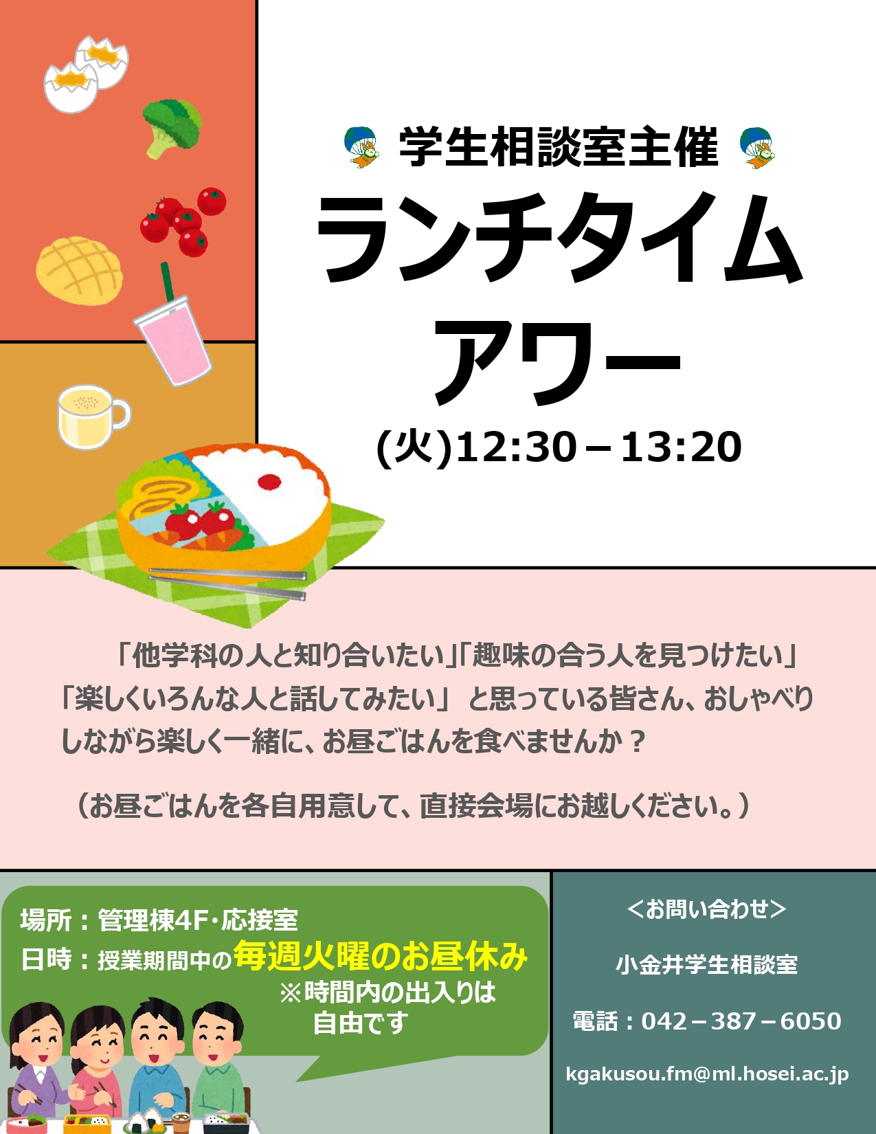 昨年に引き続き、他学科との交流や、友達作りなど、楽しくお昼ご飯を食べたい方向けに、学生相談室を毎週火曜のお昼休み(授業期間の12:30-13:20)に開放することになりました。お弁当を持って、ぜひ気軽にお越しください。なお、昨年度と場所が変わりましたので(相談室と同階の「応接室」)ご注意ください。では、お待ちしております。