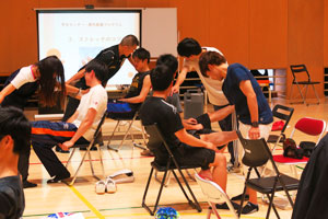 当日はパワーポイントによる「柔軟性の意味を考える」と題した講義と椅子を利用してのストレッチなど実習を組み合わる形式で行われました。はじめに伊藤教授よりスポーツを通じて発生する「ケガ」や「痛み」の原因について解説があり、正しいストレッチを行うことで筋肉の張りや固さをほぐして痛みを取り除き、ケガを回避することができることを理論的に説明していただきました。次に、椅子を利用して、正しい・効果的な「ストレッチング」を、参加者全員で行いました。あわせて、ストレッチの1つひとつにどのような意味や効果があるのかについて、丁寧に解説していただきました。今回得た知識を、ぜひケガ防止に役立ててもらいたいと思います。