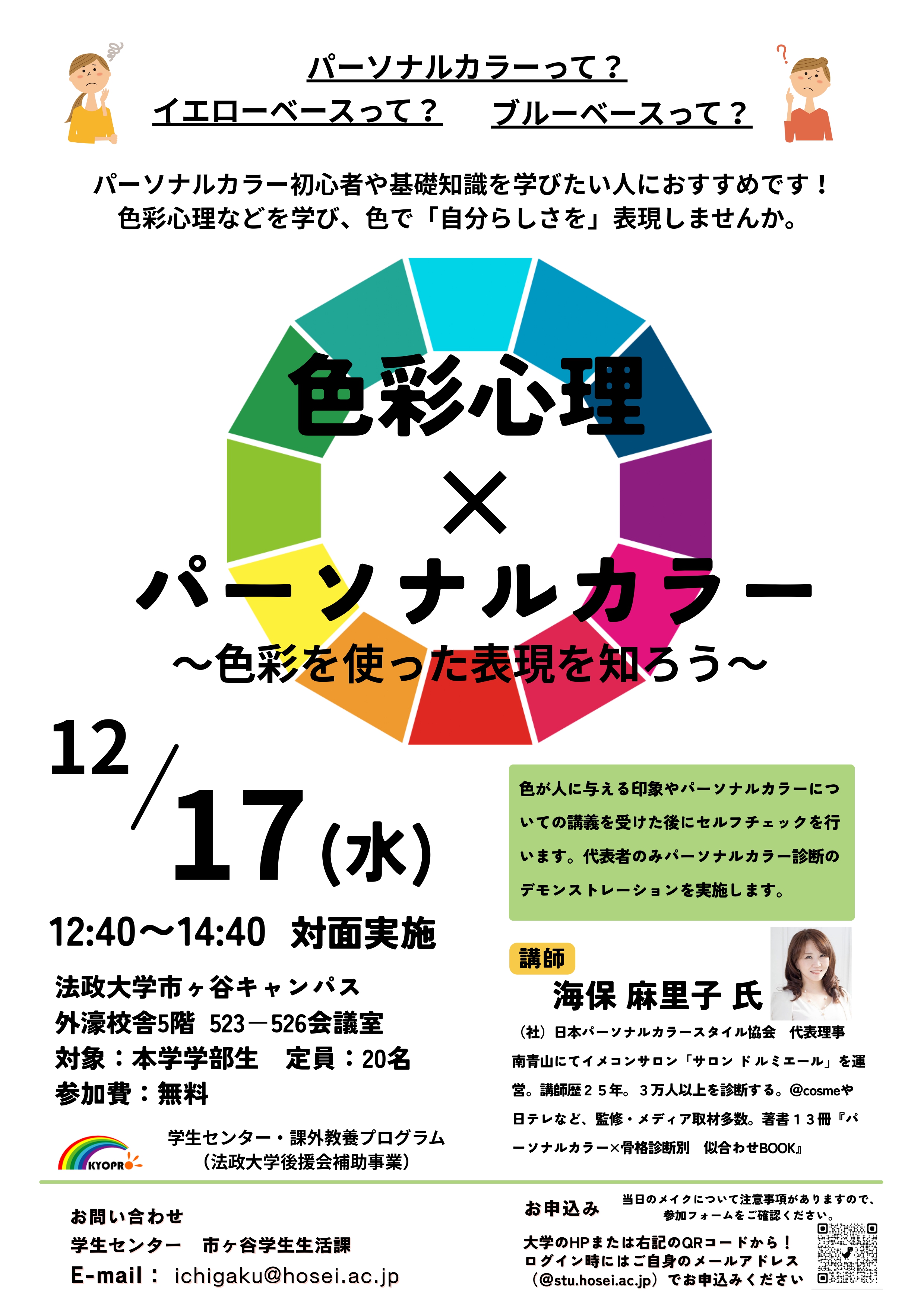 「色彩心理やパーソナルカラーの基礎知識を学び、日常生活に生かしてみたい!」