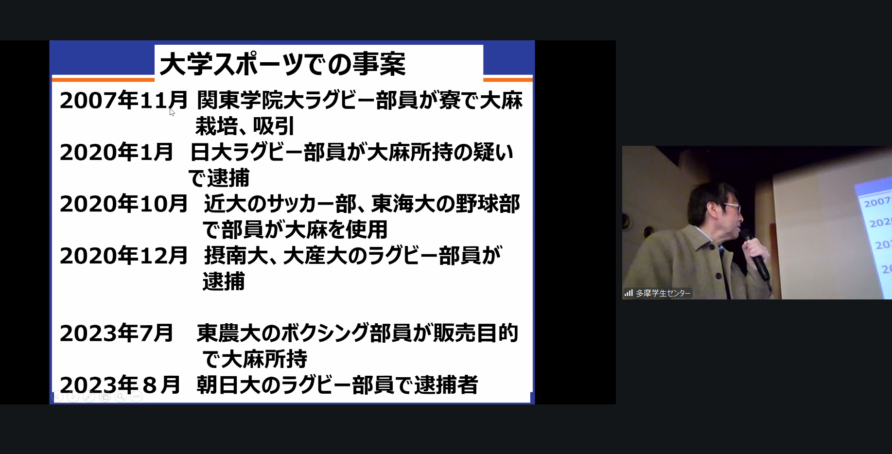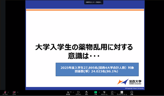本プログラムは、2012年度より実施しているプログラムで、本年度は多摩キャンパスでは対面開催、市ヶ谷・小金井キャンパスではオンライン開催としました。保健教育学を専門とする本学スポーツ健康学部の鬼頭先生をお招きし、大学生の薬物への意識や実態、健康への影響、薬物依存のきっかけなど様々な角度から薬物の危険性をお話しいただきました。プログラム終了後は大学ホームページ上で期間限定のオンデマンド配信を行い、各学生団体の代表者は所属員への共有用として活用しました。