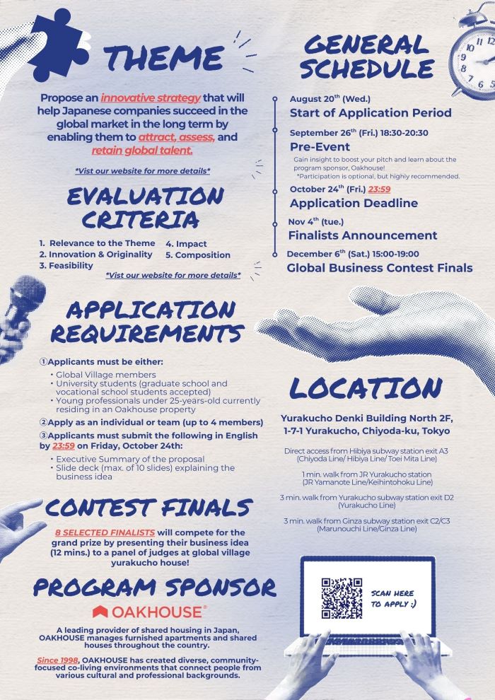 本コンテストは、次世代の起業家やイノベーターが自らのアイデアを形にし、審査員に提案することで、創造力と戦略的思考を磨く ことを目的とした英語によるビジネスコンテストです。株式会社Oakhouseをスポンサーに迎え、グローバルビレッジ有楽町ハウスが法政大学GIS(グローバル教養学部)と協力して開催します。応募者は書類審査を経て、ファイナリストは 12月6日(土) にプレゼンテーションを行います。