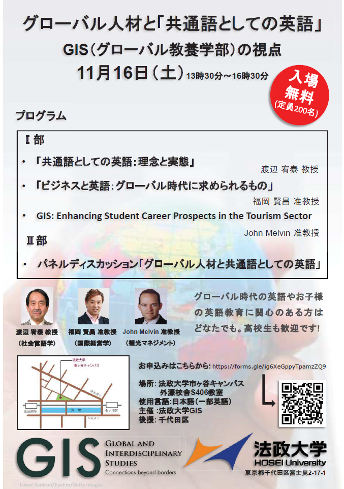GIS(グローバル教養学部)では、千代田区の後援のもと、シンポジウム『グローバル人材と「共通語としての英語」 GIS(グローバル教養学部)の視点』を開催いたします。