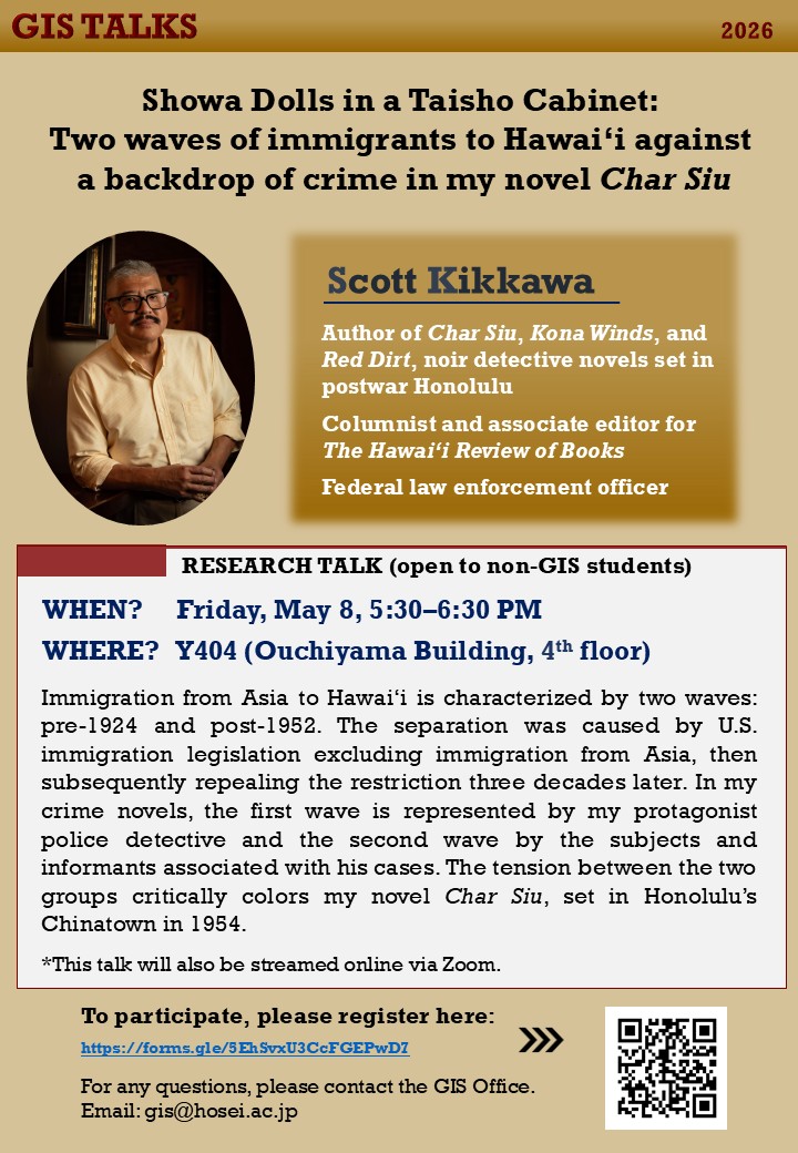 Mr. Scott Kikkawa will be speaking on “Showa Dolls in a Taisho Cabinet: Two waves of immigrants to Hawai‘i against a backdrop of crime in my novel Char Siu.”