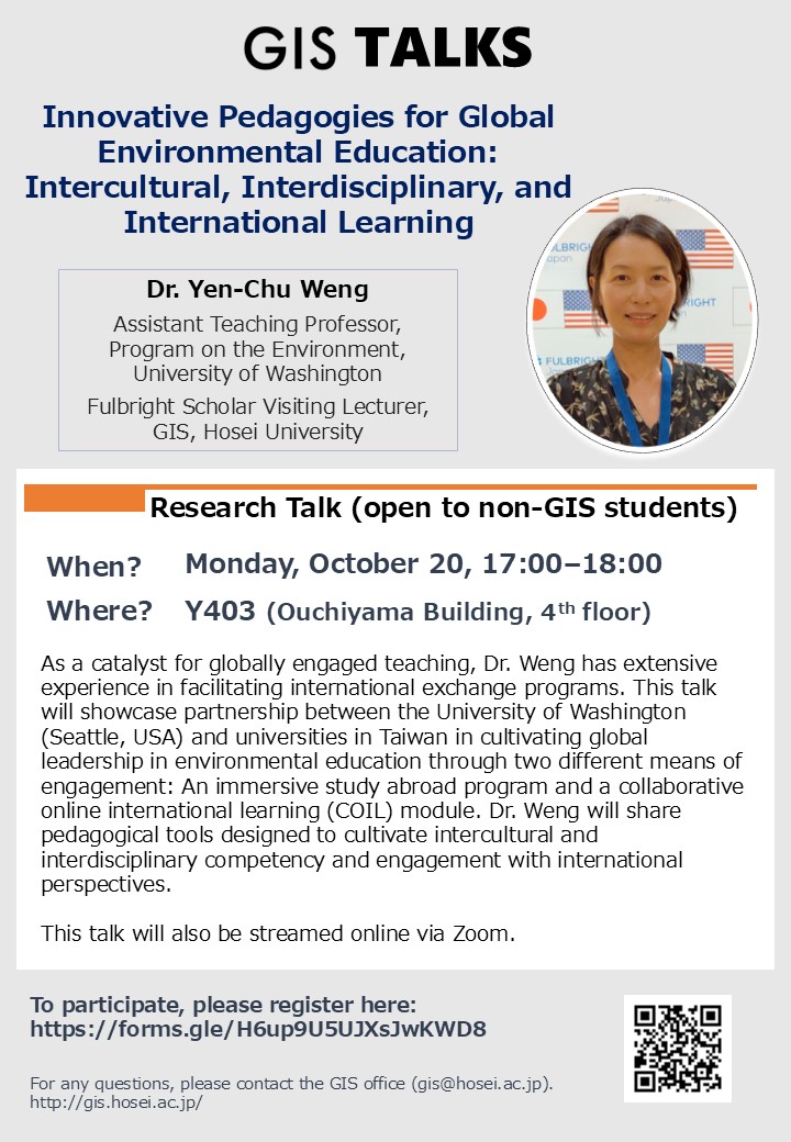 Dr. Yen-Chu Weng of University of Washington will give a talk titled “Innovative Pedagogies for Global Environmental Education: Intercultural, Interdisciplinary, and International Learning.”