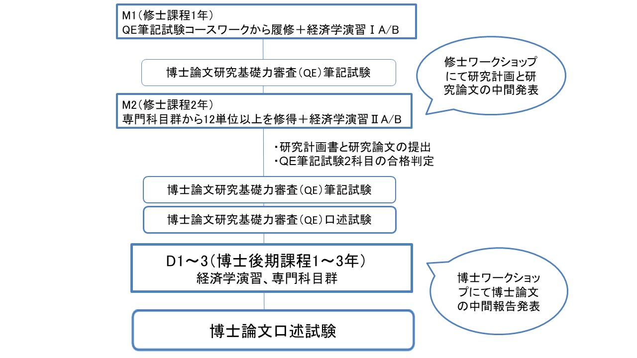 | M2(修士2年) | 専攻分野コースワーク(専門科目群から6科目) 経済学演習ⅡA/B ( 修士ワークショップ発表 ) |