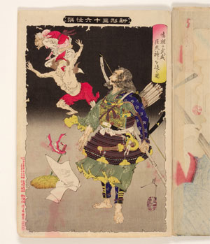ここで紹介するのは、子規文庫収蔵の芳年の作品のうち、晩年の作で、従来の浮世絵の技法を超越し、より洗練された独自の作風を確立した作品といわれる、『月百姿(つきひゃくし)』『新形(しんけい)三十六怪撰』の一部です。