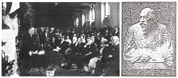 (左)1934年6月27日、パリ大学で行われた胸像除幕式の一場面。演台に立っているのは、アリックス法科大学長 (右)東京地方裁判所にボアソナードの胸像が設置されたことを伝えた、1913年6月16日付の東京朝日新聞に掲載された写真