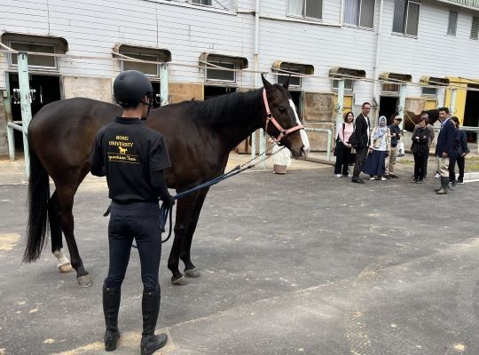 The purpose? To meet with a delegation from UMY (Universitas Muhammadiyah Yogyakarta) in Indonesia, as part of an international project of the Institute of Human-Horse Well-being, led by Professor Ryuhei Sano of the Faculty of Social Policy and Administration. Professor Takami of the Faculty of Sports and Health Studies, along with the coaching staff and students of the equestrian club, was also there to explain the activities the horses are involved in.