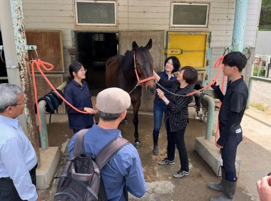 人馬のウェルビーイング研究所を中心とした学内の連携や、そこに関わる教員・学生・コーチングスタッフの皆さんの取り組みの可能性を垣間見ることができ、大変印象深い時間となりました。そして何より、見学するだけでなく、実際に馬に触れ、ブラッシングをさせてもらう貴重な機会をいただけたことに、心から感謝しています。