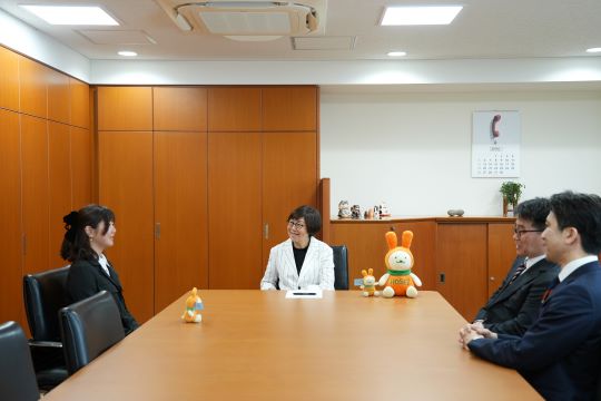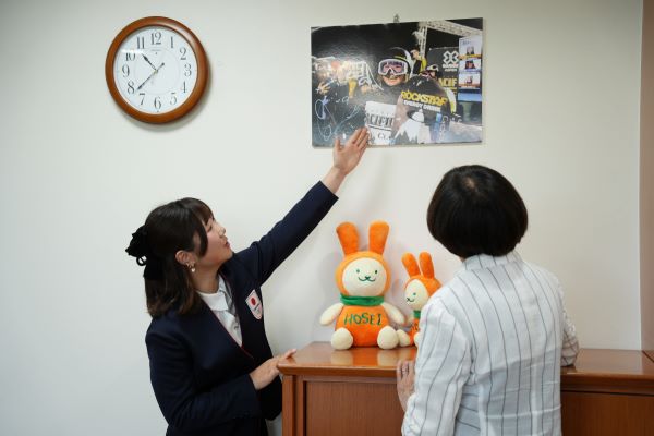 昨年私が移った総長の執務室には、最初から一枚のサイン入り写真が飾られていました。そこには、ヘルメットとゴーグルに身を固めたスノーボーダーが、鮮やかなデザインのボードとともに写っており、その背後のスコアボードには、日本人の名前―岩渕麗楽―がトップに「金」として表示されています。ウィンターXゲームズで撮影されたその写真を一年間眺め続けた末、ついに本人にお会いする機会を得ました。