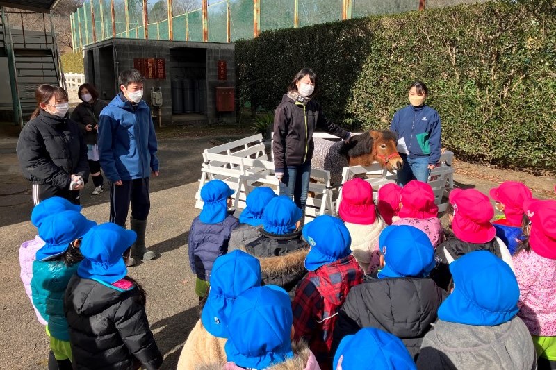 法政馬広場に幼稚園児を招いてポニーとの触れ合い体験を開催。学生や職員だけではなく、地域の小学生や幼稚園児など学内外の幅広い世代を対象に活動を行っています。