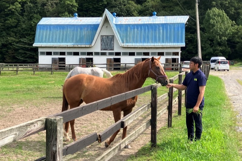 地域の基幹産業の理解を深め、地方創生について学ぶことを目的に、学生たちが競走馬の産地である北海道新冠町の牧場を訪ね、馬の世話などの作業体験を行いました。