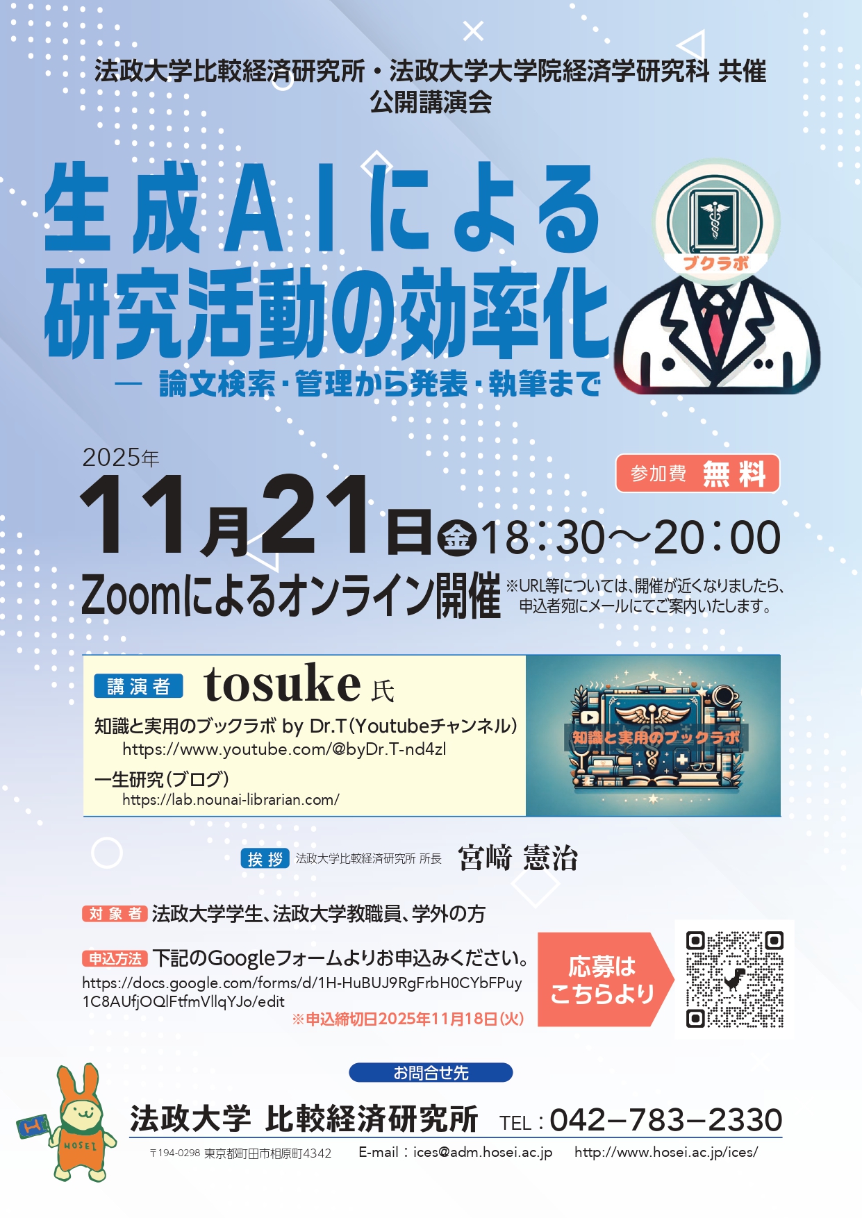 | 開催方法 | 法政大学多摩キャンパス経済学部棟102教室及びオンライン開催(Zoom) |