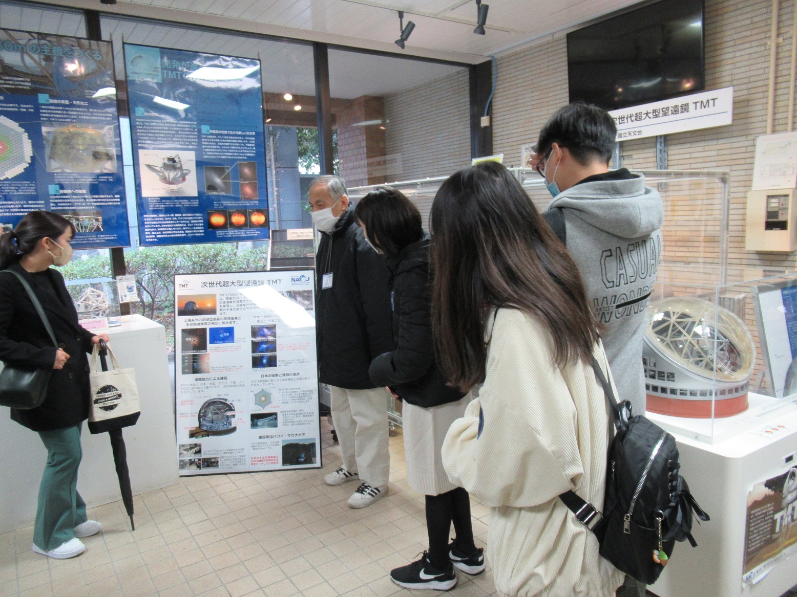 更には、「展示室」においては、巨大な質量が激しく運動・変化する天体現象から発せられる重力波を検出して、他の手段では観測することができない現象の核心に迫る「重力波天文学」における重要な研究成果の干渉計型重力波アンテナ「TAMA300」や日本、アメリカ、英国の国際協力のもとで開発が進められ、今でも現役で活躍する「太陽観測衛星ひので」、日本、米国、カナダ、中国、インドの国際協力のもとで建設が進められている光学赤外線・次世代超大型天体望遠鏡「TMT(Thirty Meter Telescope、30メートル望遠鏡)」を始めとした国立天文台における最新の研究成果の一端を模型やパネルを用いてご紹介いただきました。