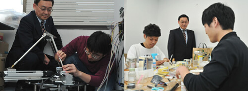 「アクチュエータ・センサや素材選びから設計、制御、製造と、一連の機械システムの総合デザインを行うメカトロニクスは成熟した分野ですが、組み合わせは無限大。使途の観点からはまだまだ発展の可能性を秘めています」と話すのはデザイン工学部システムデザイン学科の教授であり、情報メディア教育研究センター所長も務める田中豊教授。 「有能なスタッフ」と呼ぶ研究室(高機能メカトロデザイン研究室)の学生たちと2015年12月現在、「次世代モーションメカニズム(MB)」「スマート&グリーンフルードパワー(FP)」「マイクロメカトロデバイス(MM)」「感性とインタフェースデザイン(IF)」の4つを柱に、社会の要請に応えた研究開発を進めています。