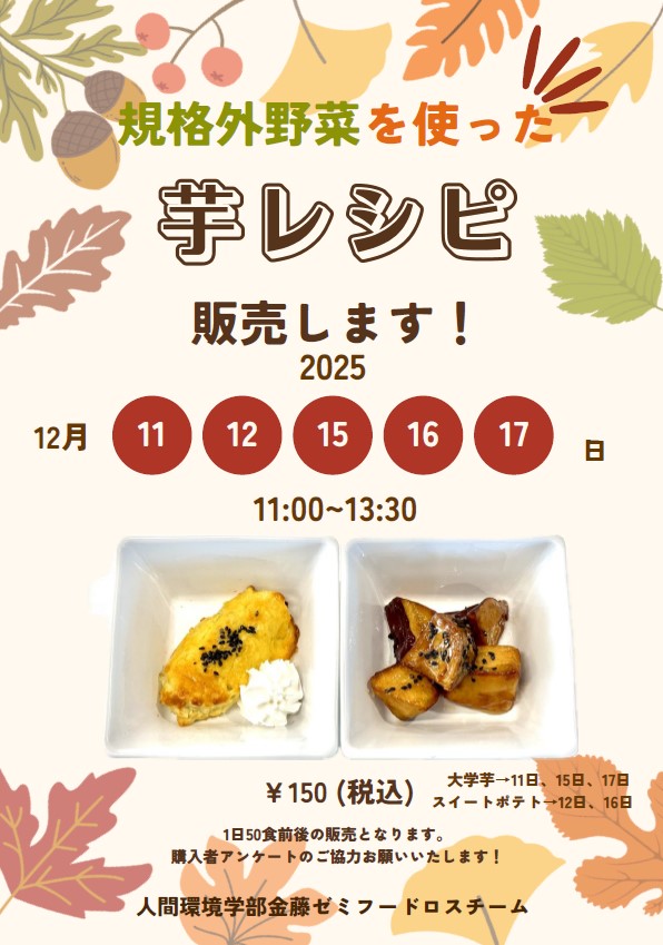 今回使用する規格外野菜は、サツマイモ・里芋・小松菜の3種類です。形や大きさにばらつきがあるものの、品質や安全性には問題ありません。販売メニューは大学芋小鉢(1日50食/150円)です。大学芋は規格外のサツマイモを食堂で加工した商品で、学生にとって身近に食品ロス削減へ貢献できる機会になるように、手頃な価格を設定しています。また、学食の各メニューに添える付け合わせとして里芋・小松菜を使用しています。
