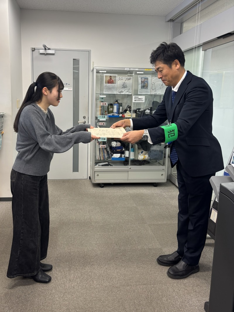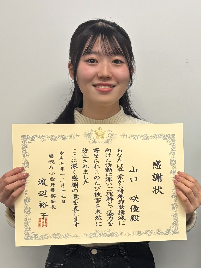 1月16日(金)、山口咲優さん(理工学部機械工学科4年)が、特殊詐欺被害を未然に防いだとして小金井警察署より感謝状を授与されました。1月23日(金)山口さんから、鍵和田聡小金井学生センター長に今回の感謝状授与の報告がありました。
