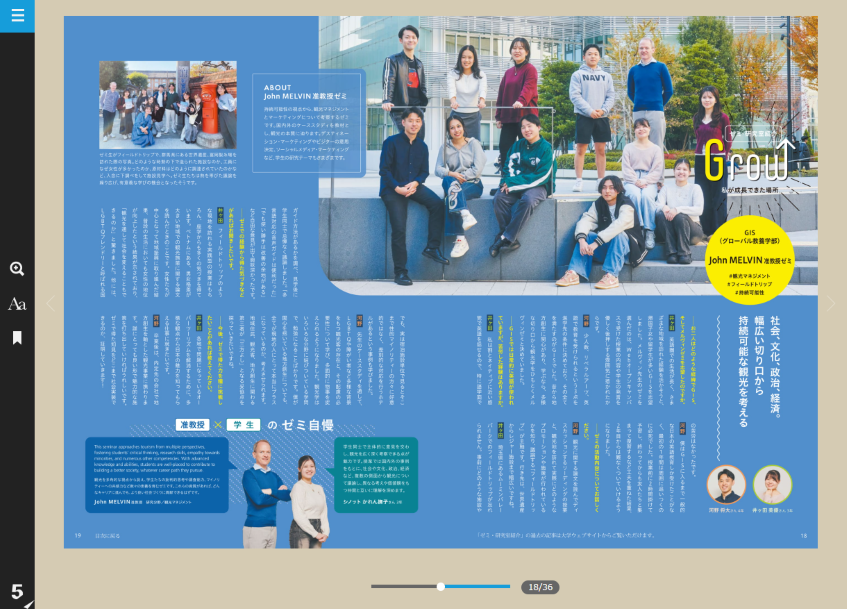 GIS(グローバル教養学部)John MELVIN准教授ゼミを取材。持続可能性の視点から、観光マネジメントとマーケティングについて考察。国内外のケーススタディを教材とし、観光の本質に迫っています。観光に関する論文を読んでディスカッションするリーディングの授業と、観光地を訪れて実際にどのようなプロモーションや施策が行われているかを議論する「フィールドトリップ」がゼミ活動の主軸です。
