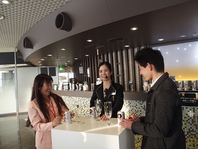 エコツアー終了後は、東京湾の夕暮れが臨めるマリンハウスで、家庭でも実践できる美味しいビールの注ぎ方を体験しました。
