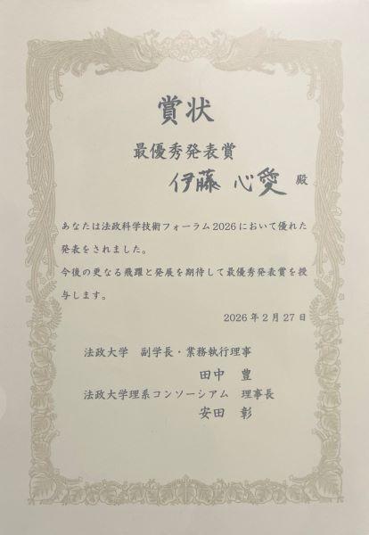 法政科学技術フォーラム2026で発表し、最優秀発表賞を受賞しました。