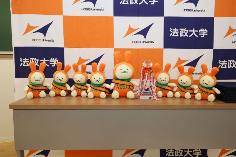 「自由を生き抜く実践知大賞」の襷をかけた えこぴょんのぬいぐるみ