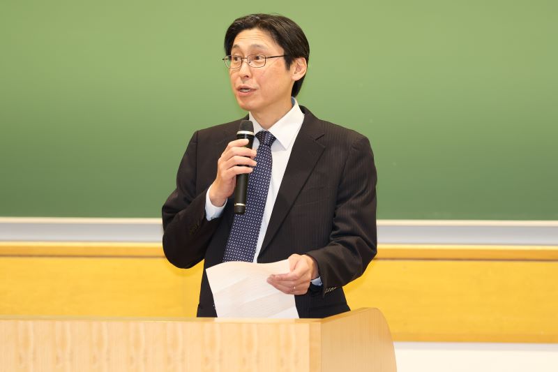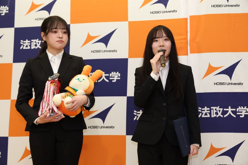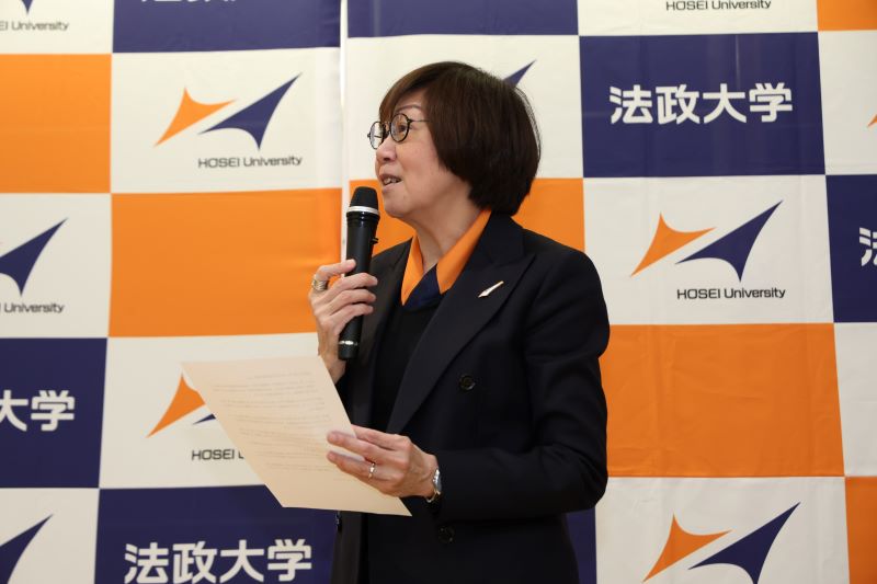「社会からの期待が一層高まる中にあって、法政大学の原点を大切にしながら、教育・研究の理想を追求し、社会的責任を果たすための指針として、2016年に自由を生き抜く実践知という大学憲章を制定しました。憲章を定めること自体は重要ですが、何よりも大切なのは、この指針に基づいて行動することです。本日発表された皆さんの活動は、まさにこの憲章を体現するものでした。憲章に基づきさまざまな賞を設けていますが、いずれの取り組みにも共通しているのは、憲章に記された理念や価値観を、それぞれの関心や活動分野において具現化している点です。皆さんの活動を拝見し、自由を生き抜く実践知が持つ無限の可能性と、より良い未来の創造へと確かにつながっていることを改めて確認することができました。特に学生の皆さんには、在学中はもちろん、卒業後もこの憲章を行動の指針として大切にし、活かしていただけることを期待しています。本日はありがとうございました。」と述べ、最後にノミネートされた実践主体ごとに写真を撮影し、閉会いたしました。