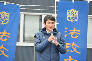 駅伝チームの坪田智夫監督は決意表明で、小金井キャンパスで学んでいる陸上競技部員で今大会のエントリーメンバーにも選ばれている青木涼真選手(生命科学部2年)の紹介と「本戦でも活躍してくれるはずなので、キャンパスの仲間をテレビや沿道でぜひ応援してほしい」と学生へ語りかけました。
