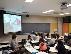 後藤ゼミでは、ゼミ活動の一環として映像制作にも取り組んでいます。グループを組み自作自演でショートムービーを作り、毎年NHK主催の「NHKミニミニ映像大賞」というコンクール(今年のテーマは「見た人が、少し優しい気持ちになれる。そんな30秒の映像作品」)に出品しています。哲学と映像とは一見結び付かないようですが、構想や撮影、編集といったプロセスを経て「意味」と画像や音声イメージを結び付け、作品を作り上げる一連の過程は、「ものごとを認識する」とはどういうことかを振り返るきっかけとなる作業です。学生たちは、アイデアや示唆、趣向に富んだ作品を作り上げます。制作だけでなく映像論のテキストも輪読し、理解を深めています。
