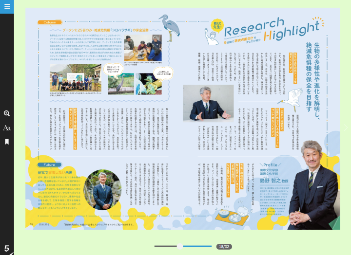 トキやヤンバルクイナのウモウダニの研究をしていたことをきっかけに、ブータンに生息する絶滅危惧種の鳥、シロハラサギの保全活動に取り組む島野教授。日本のシロハラサギ保全チームの代表として専門家と共に、ブータン王立自然保護協会と連携しながら活動を展開しています。2024年には、人工孵化と雛の育成に成功するなど大きな成果を上げました。「現在はブータンにおける生物多様性の現状を記録するため、自然史博物館の設立計画が進行中です。長期的な視点が求められる大規模プロジェクトで困難も多いですが、現地のスタッフと互いに敬意を持って協力し合いながら研究を深めていくプロセスに、やりがいを感じています」(島野教授)。記事には、ツイッター(現X)を通じて新種のダニを発見したエピソードなどを掲載。この数年の、世界平均気温が史上最高を更新、という地球環境の異変に触れ、「生物多様性」の重要性を示します。