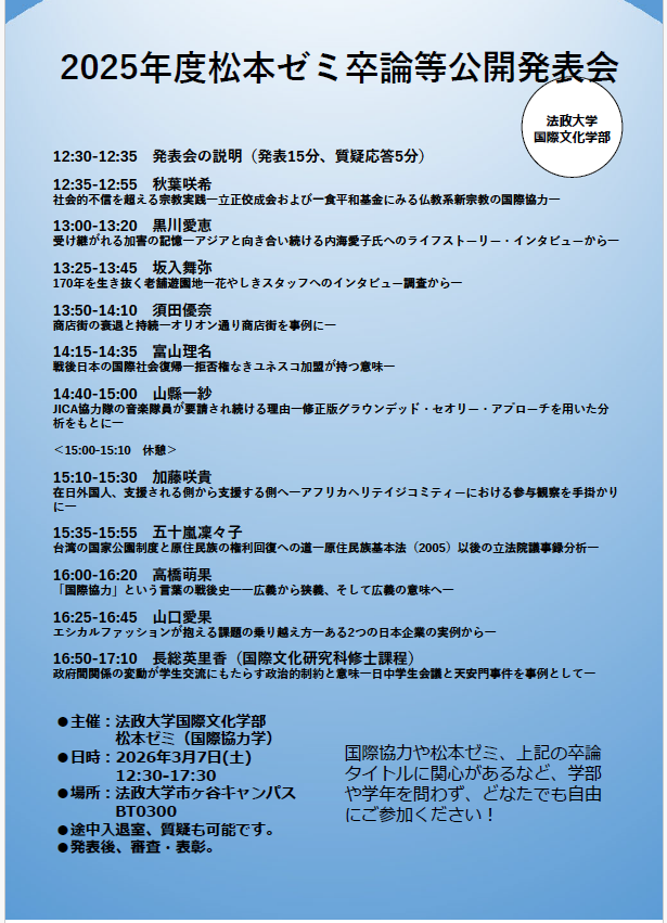 国際協力や松本ゼミ、卒論タイトルに関心があるなど、学部・学年を問わず、どなたでも自由にご参加ください。