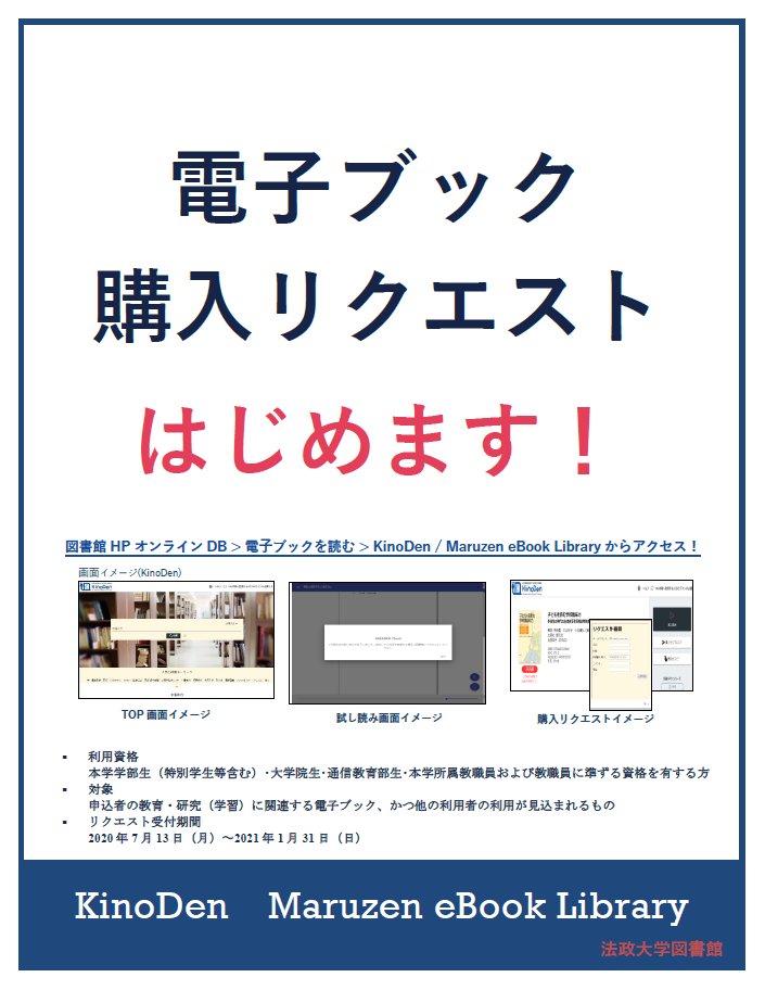 - オンラインデータベース一覧 > 電子ブックを読む > KinoDen / Maruzen eBook Libraryからアクセス。