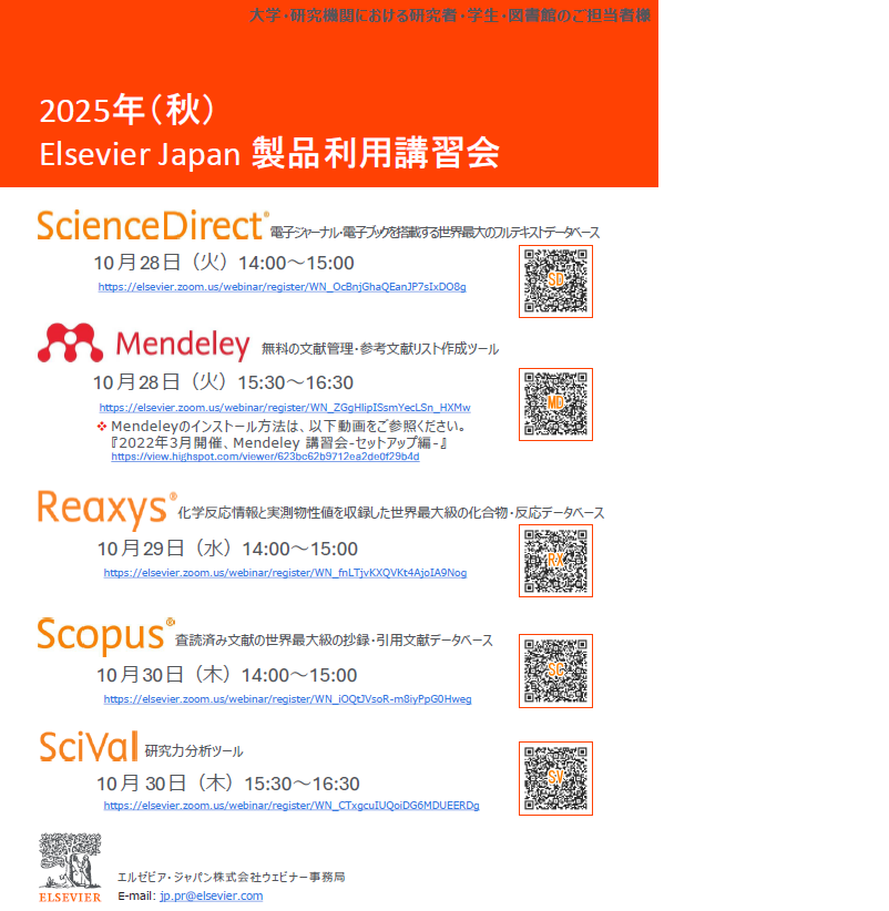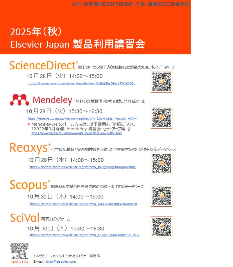 Elsevierが本学と契約しているデータベース ScienceDirect, Reaxys, Scopusならびに研究力分析ツールSciVal, 無料の文献管理・参考文献リスト作成ツールMendeleyの利用講習会を開催します。参加には事前登録が必要です。