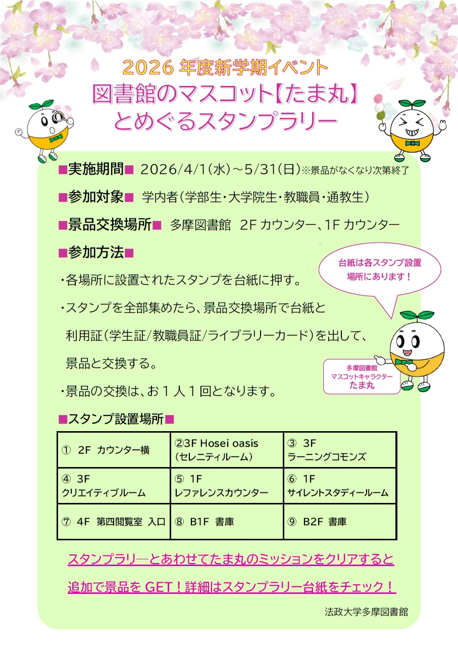 多摩図書館では、新学期の開始にあわせて「図書館のマスコット【たま丸】とめぐるスタンプラリー」を開催します。