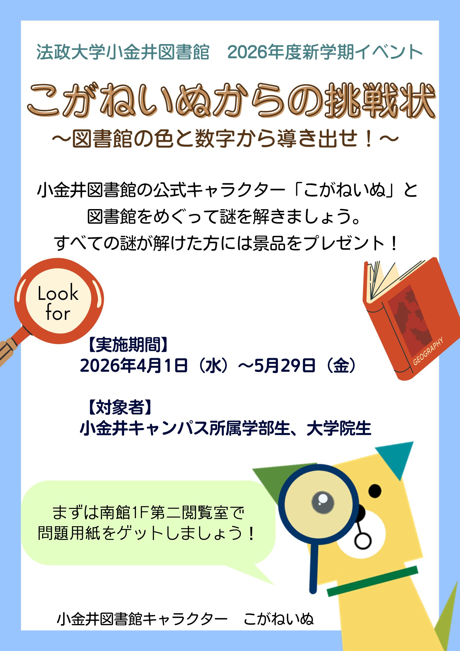 【イベント】(小金井)新学期イベント:こがねいぬからの挑戦状 ~図書館の色と数字から導き出せ!~