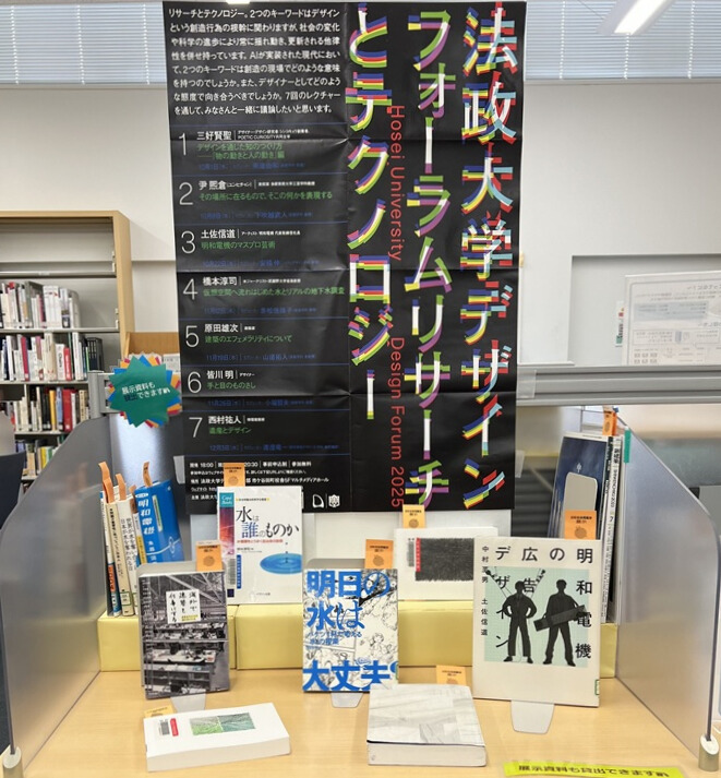 デザイン工学部で開催される『デザインフォーラム2025 リサーチとテクノロジー』にあわせ、フォーラムの講演者の著作や関連雑誌記事のうち、法政大学図書館に所蔵している資料を展示します。