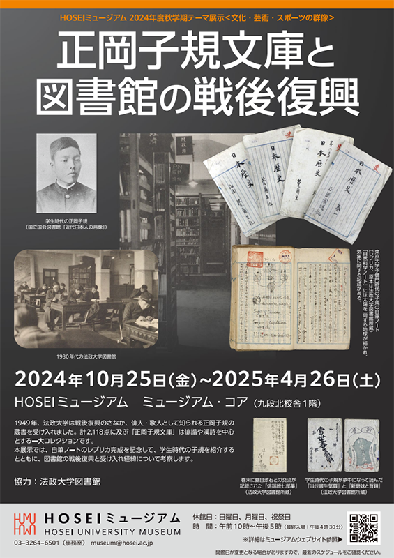 HOSEIミュージアムでは、2023年度に子規の学生時代の自筆ノートのレプリカを作成しました。本展示では、レプリカの完成を記念し、図書館の戦後復興と子規の蔵書の受け入れ経緯について考察するとともに、学生時代の子規の姿について紹介しました。