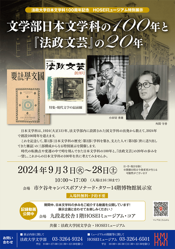 法政大学文学部日本文学科は、1924(大正13)年、法文学部に設置された国文学科の出発から数えて、2024年で創立100周年の展示でした。