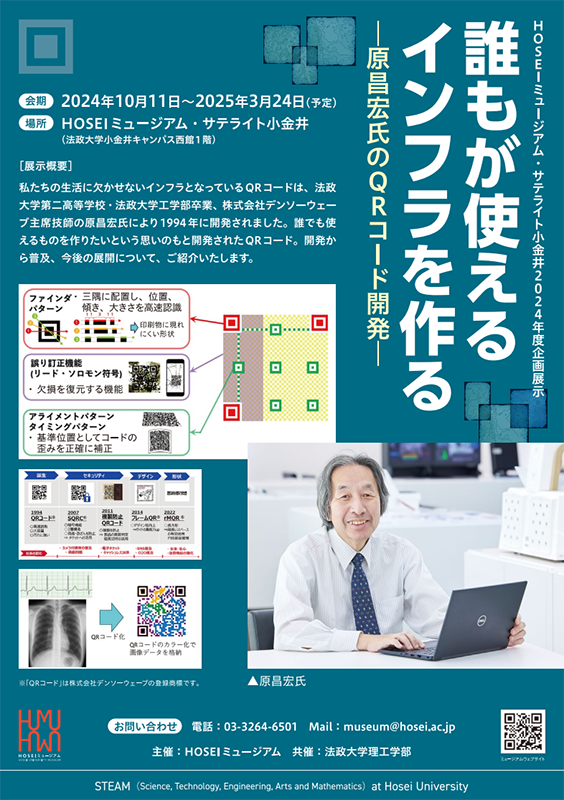 近年、決済やWebサイトへのアクセスなど、QRコードは私たちの生活の様々な場面において欠かすことのできないインフラとなっています。このQRコードを開発したのは、法政大学第二高等学校、法政大学工学部電気工学科(現:理工学部電気電子工学科)卒業、株式会社デンソーウェーブ主席技師の原昌宏氏です。本展示では、誰でも使えるものを作りたいという原氏の思いのもと開発されたQRコード。開発から普及、今後の展開について紹介しました。