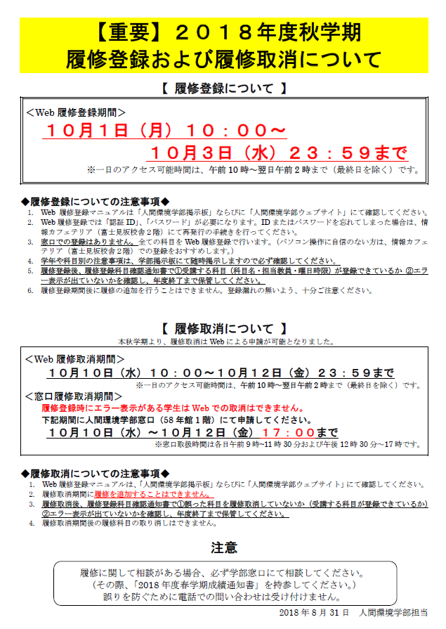 履修に関して相談がある場合、必ず学部窓口にて相談してください。(その際、「2018年度春学期成績通知書」を持参してください。)