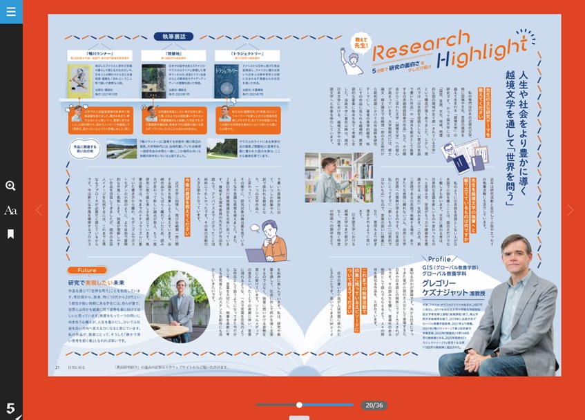 「日本語文学における越境文学はまだ数が少なく、読者が抱く特定の物語への期待をどう裏切るのかが課題です。外から日本にやってきた者が小説の主人公として登場すると、日本や日本語との関係にフォーカスされがちです。その読み方を覆し、普遍性のある物語として読んでもらえるよう、人々の期待を裏切る作品を、と試みています」と語るケズナジャット准教授。これまでの執筆活動で印象に残っているエピソードとして、執筆した小説が入試問題に使われたときのことや、2度の芥川賞候補選出のときのことを挙げています。さらに、著書の紹介と共に、執筆裏話や作品に関連する思い出の地を紹介。今後の展望についても触れています。