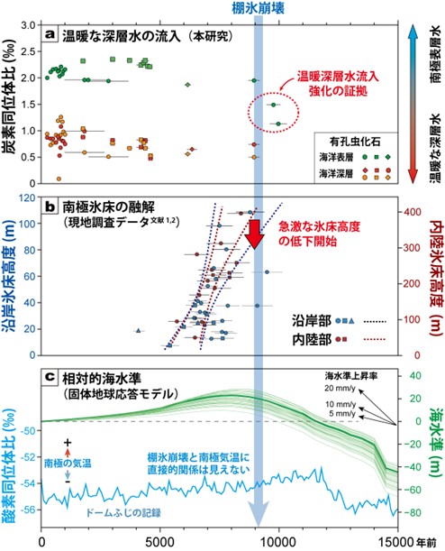• 図3:温暖な深層水の流入と棚氷の崩壊、そして南極氷床融解加速との関係。 (a) 有孔虫化石の炭素同位体データから復元した海洋表層・深層水の起源。(b) 現地調査と表面露出年代測定(注6)から復元したリュツォ・ホルム湾沿岸とドロンイングモードランド内陸部における氷床高度の変化。約9000年前から急激に南極氷床が融解したことを示す。 (c) 地球変形モデルから推定したリュツォ・ホルム湾の相対的な海水準変動と、ドームふじアイスコアの酸素同位体比から推定した東南極内陸での気温変動。