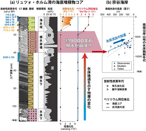 • 図2: 海底堆積物に記録された棚氷の崩壊と、それに伴う南極沿岸の氷床融解加速。 (a) リュツォ・ホルム湾から採取された海底堆積物の放射性炭素年代値、CT画像、地層の特徴、プランクトン化石の量、およびベリリウム同位体。(b) 表面露出年代測定(注6)に基づく宗谷海岸における氷床融解年代(文献1、2)。
