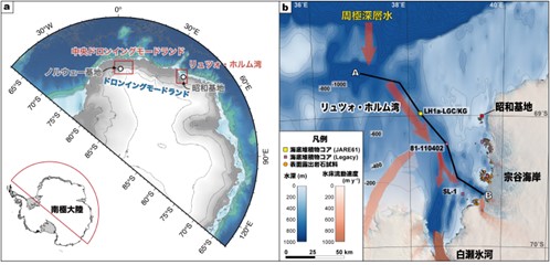 • 図1:(a)東南極氷床と、本研究の調査地域。(b)海底堆積物の掘削および岩石サンプルの採取ポイント。A-Bの線は図5の水温断面図に対応する。